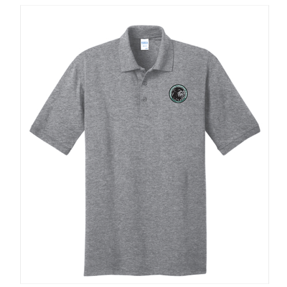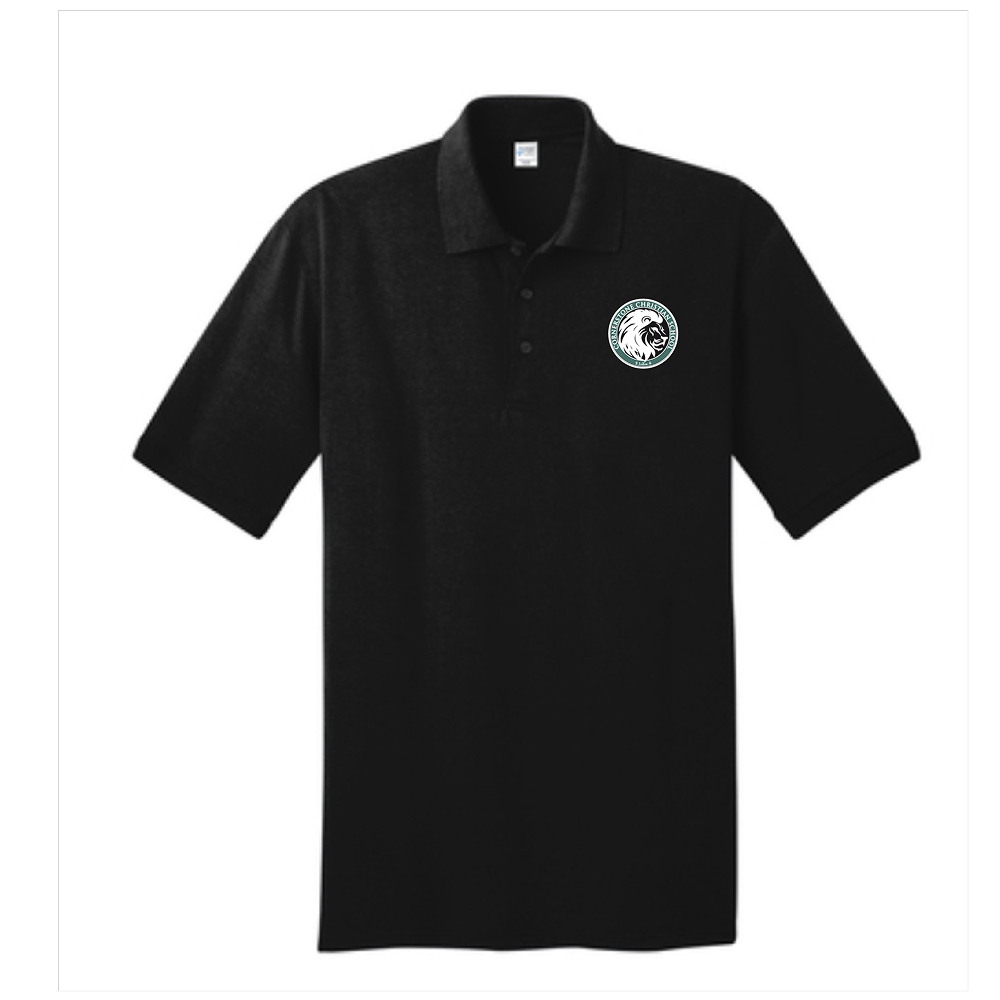 50/50 cotton/poly. Stain-release finish. 1×1 rib knit collar and cuffs. 3-button placket with dyed-to-match buttons. Double-needle hem.