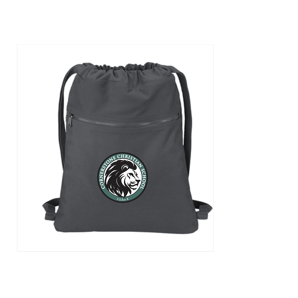 100% washed cotton. Dyed-to-match webbing cinch straps. Metal zippered front pocket. Dimensions: 17.5″h x 14″w; Approx. 245 cubic inches.
