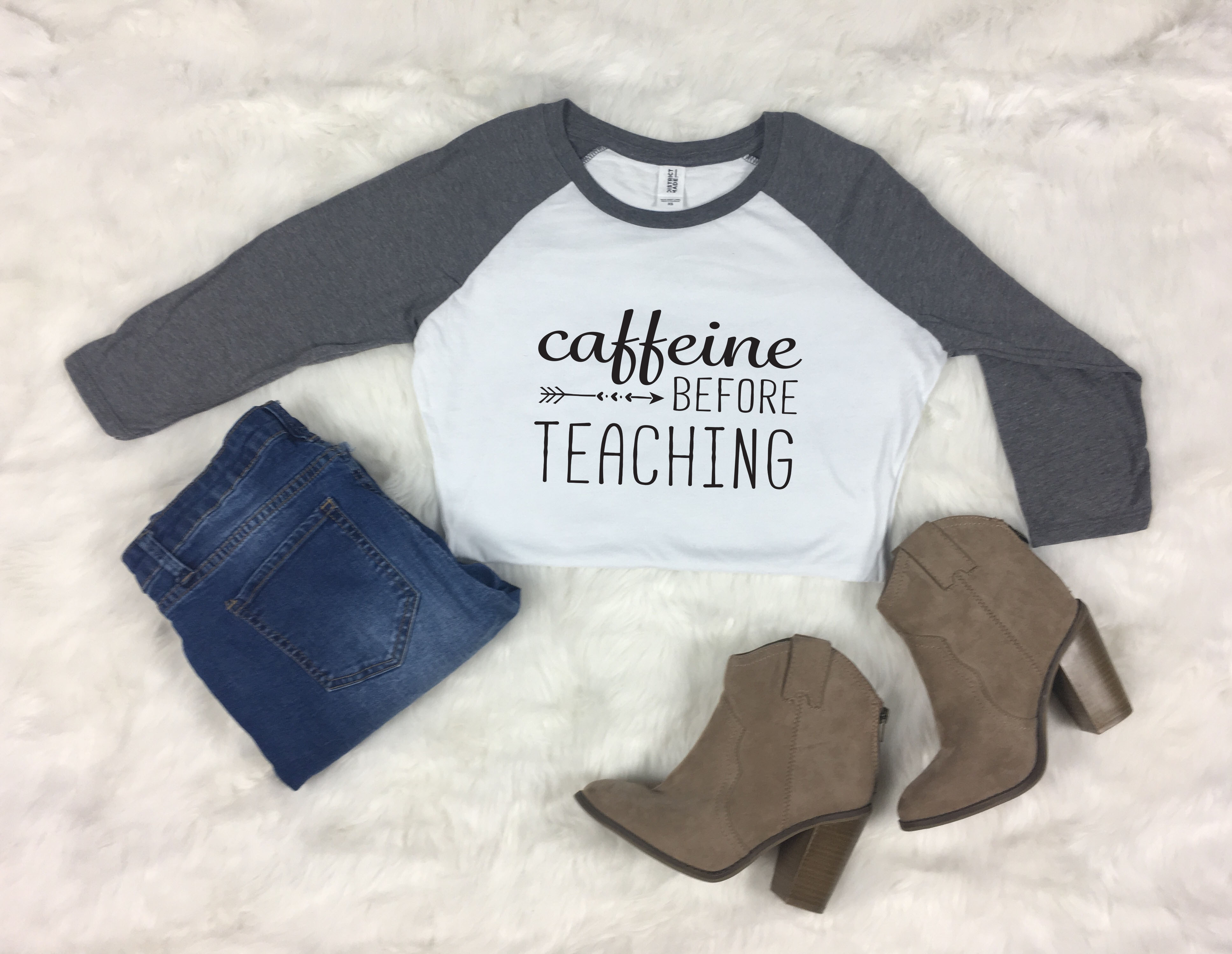 Soft cotton 3/4 sleeve shirt with “Caffeine before teaching” on the front