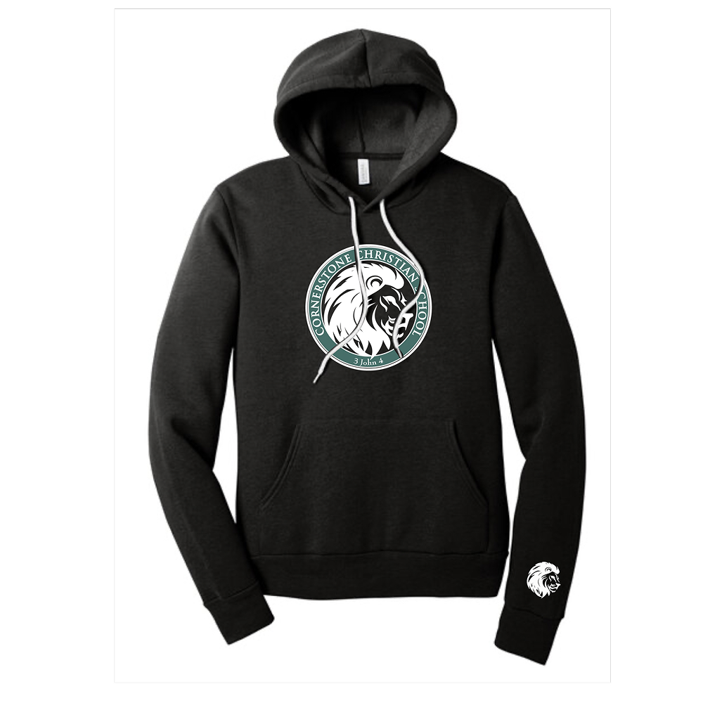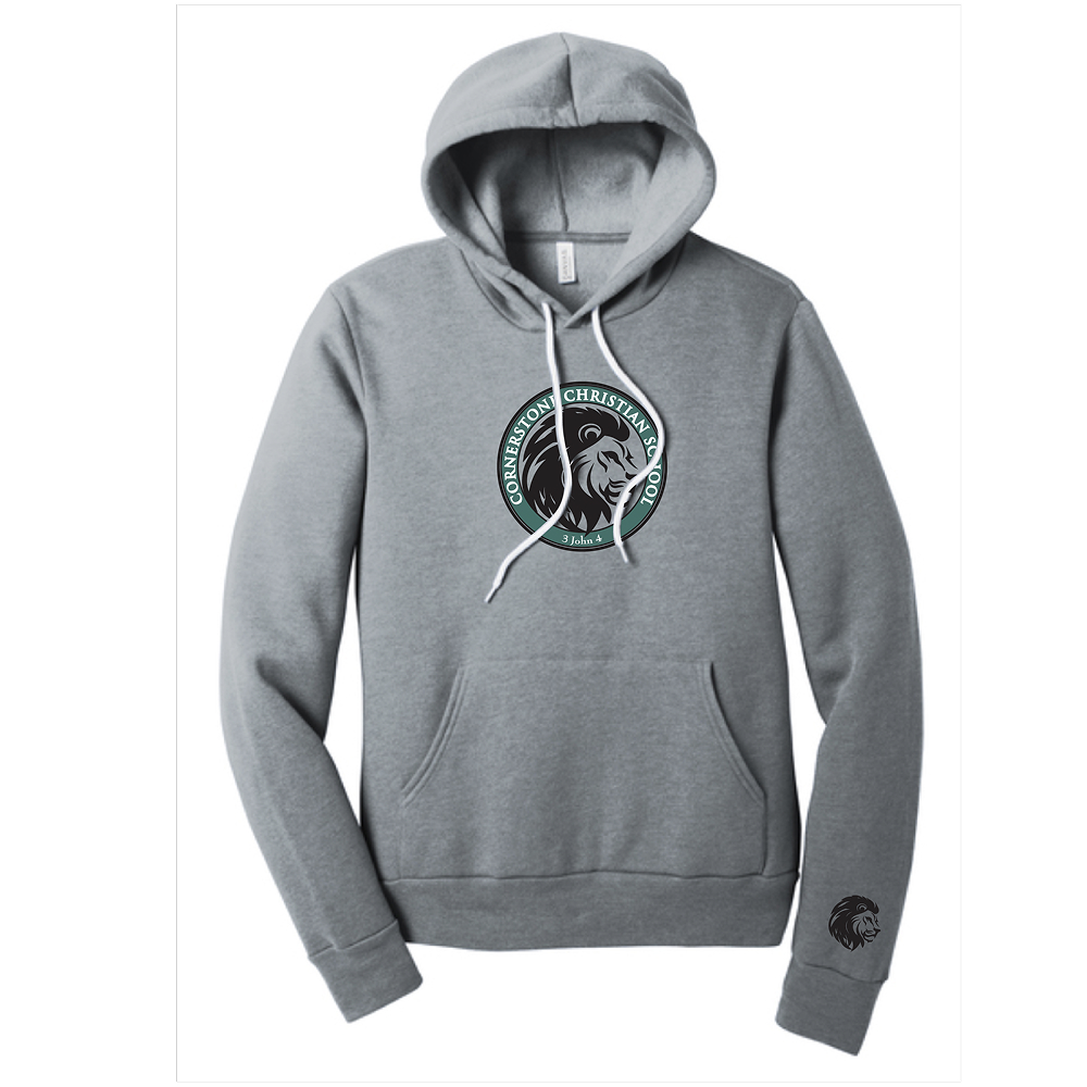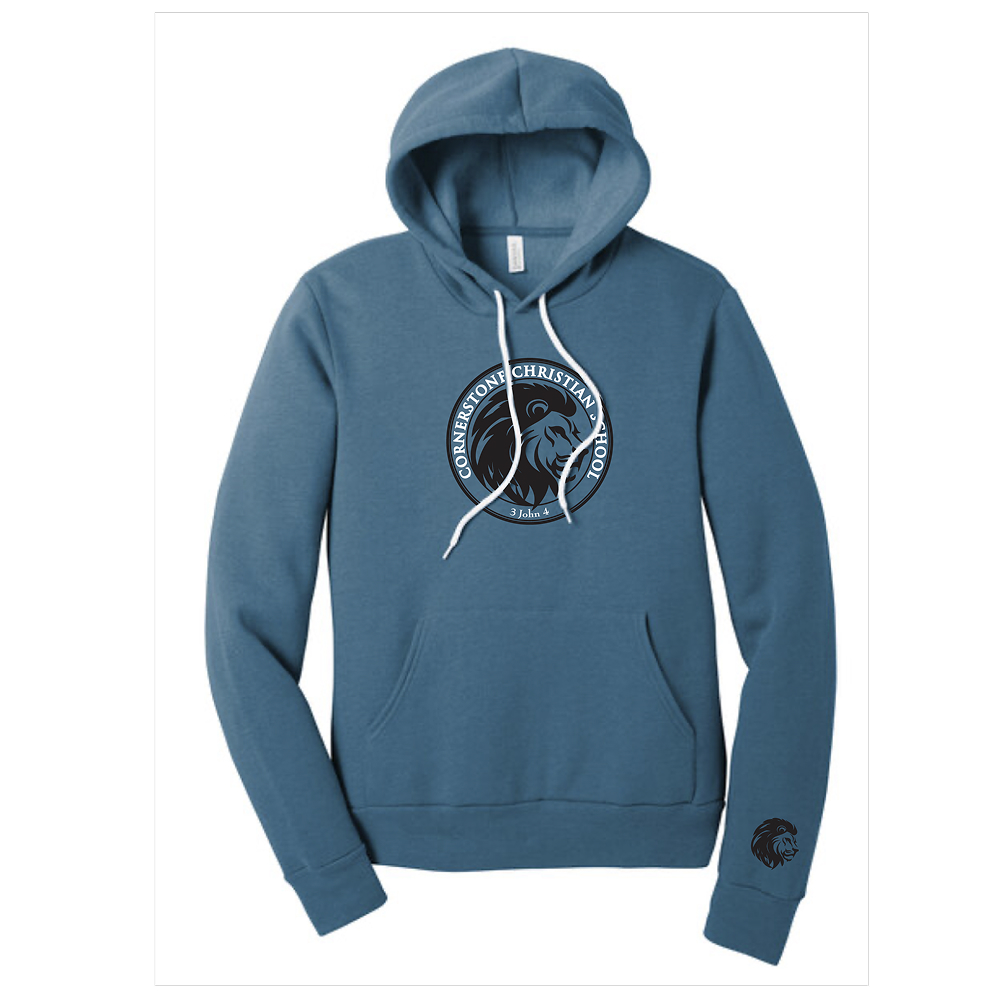 90/10 Airlume combed and ring spun cotton/poly fleece, 32 singles. Retail fit. Tear-away label. White drawcords. Side seamed. Kangaroo pockets. Rib knit cuffs and hem.