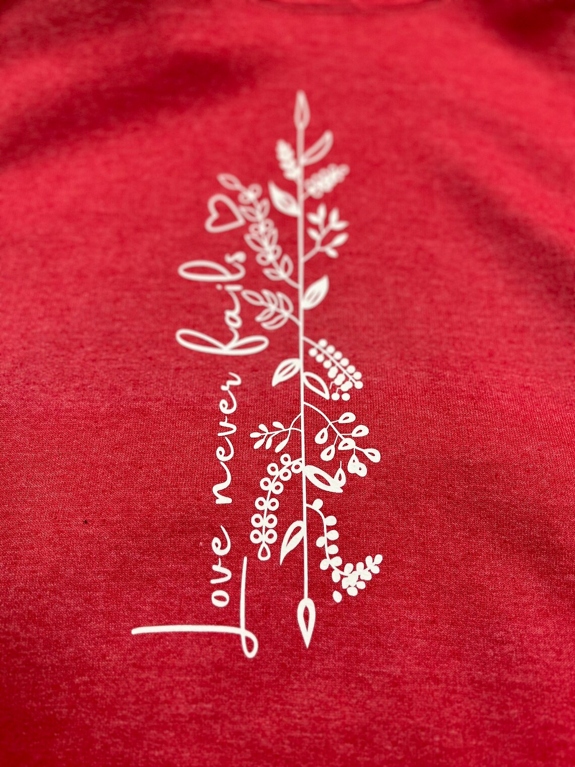 A soft cotton hoodie with “Love Never Fails” on the front.
