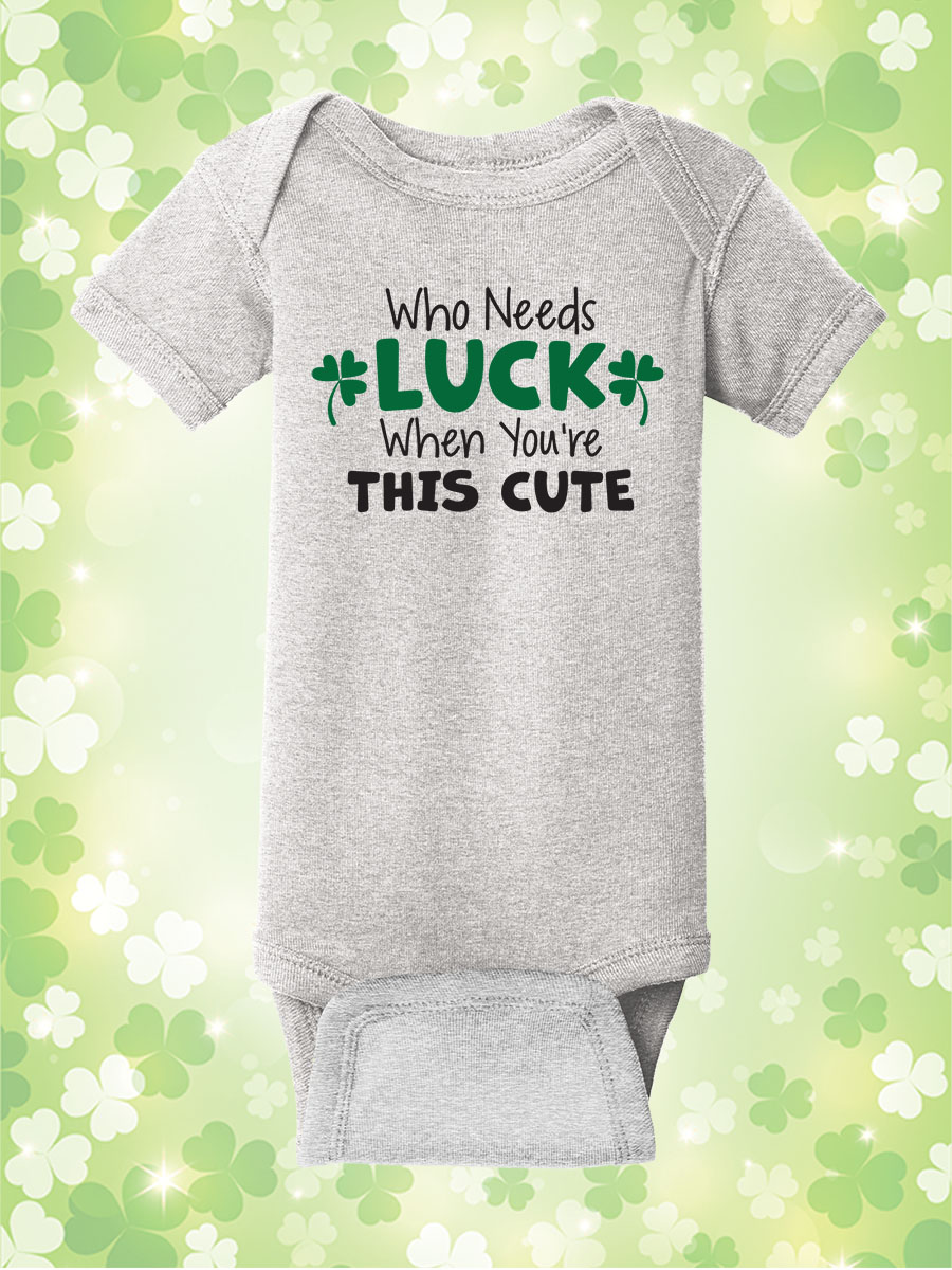 An adorable baby onesie featuring the St. Patrick’s Day Design “Who needs luck when you’re this cute!”