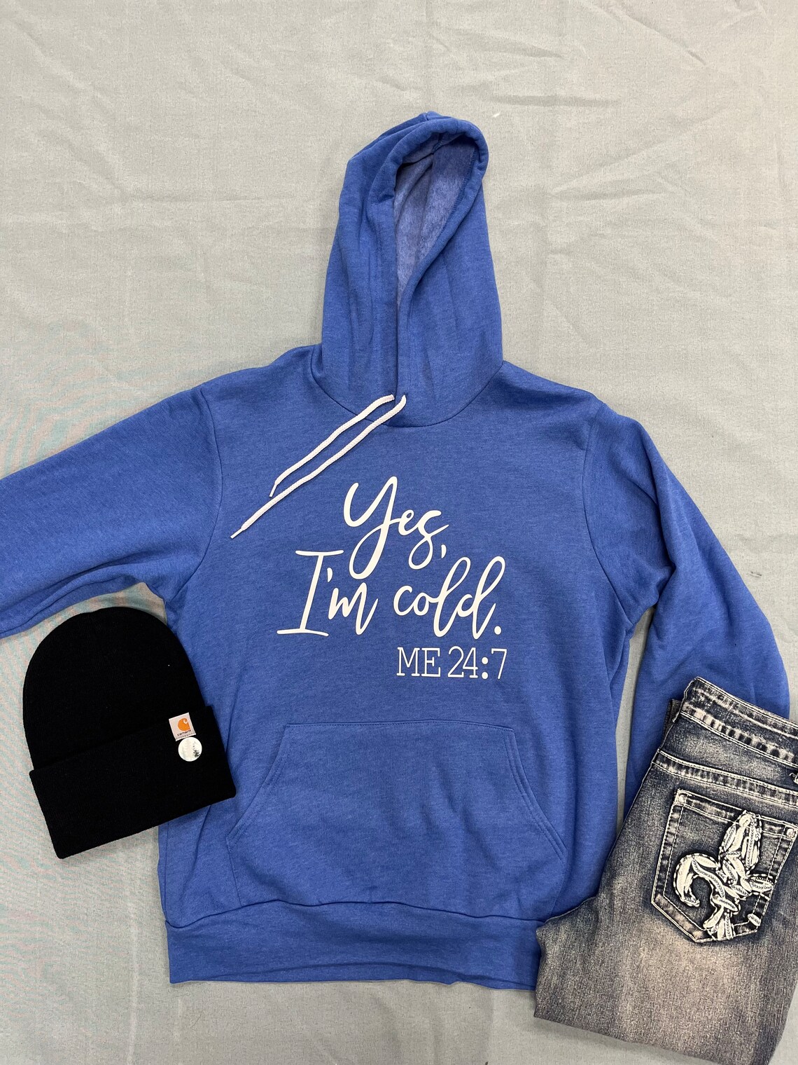 Soft, cozy hooded sweatshirt with “Yes I’m Cold, Me 24:7” on the front. Available in sizes XS – 2X.
